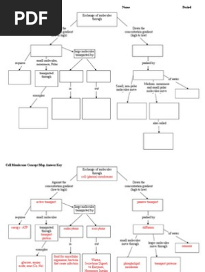 Cell Membrane Concept Map Answer Key. Exchange of molecules through. cell (plasma) membranes. Against the concentration gradient (low to high) Down the concentration gradient (high to low) active transport. requires. small molecules. exocytosis. energy - ATP. transported through. transport protein. examples. endocytosis. large molecules ...