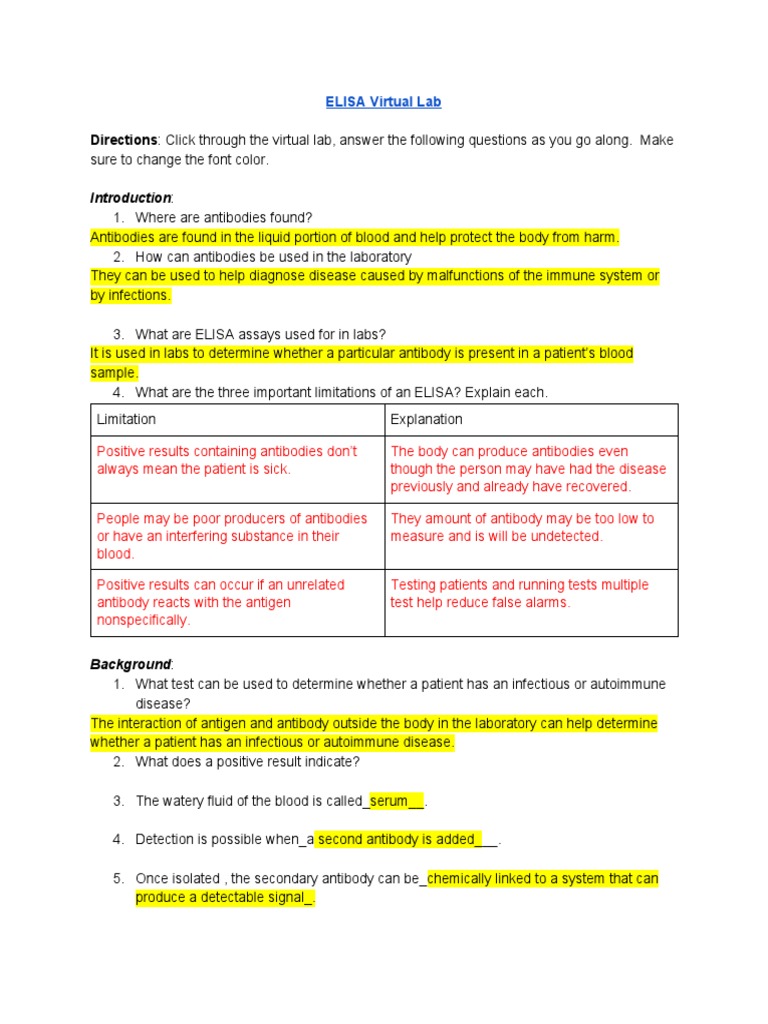 IMMUNOLOGY VIRTUAL LAB WORKSHEET Go to. Start the Virtual Lab. Answer the following questions in the spaces provided. 1. What is the principle of the ELISA based on? Enzyme-linked immunosorbent assay (ELISA) relies on specific antibodies to detect a target antigen using specific antibody-antigen interaction. A detection system is needed to ...