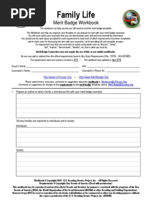 Family Life Merit Badge Workbook This workbook can help you but you still need to read the merit badge pamphlet (book). No one can add or subtract from the Boy Scout Requirements #33215. Merit Badge Workbooks and much more are below: Online Resources.