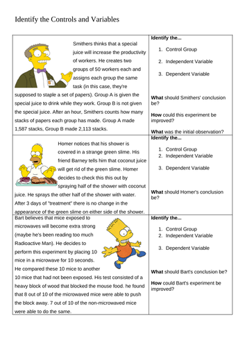 Identify the Controls and Variables. Smithers thinks that a special juice will increase the productivity of workers. He creates two groups of 50 workers each and assigns each group the same task (in this case, they're supposed to staple a set of papers).