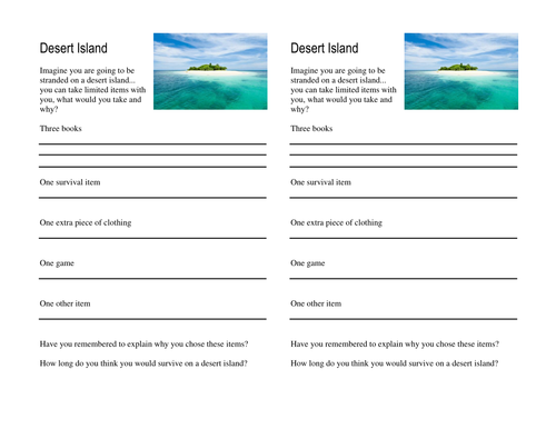 Use this stranded on an island activity worksheet to get your class thinking about which items they would bring along if they were ever stranded. Use this 'stranded on a desert island' activity worksheet alongside your lessons on desert islands, shipwrecks and wilderness survival.This adaptable activity invites students to reflect on what items they would bring to a desert island to …