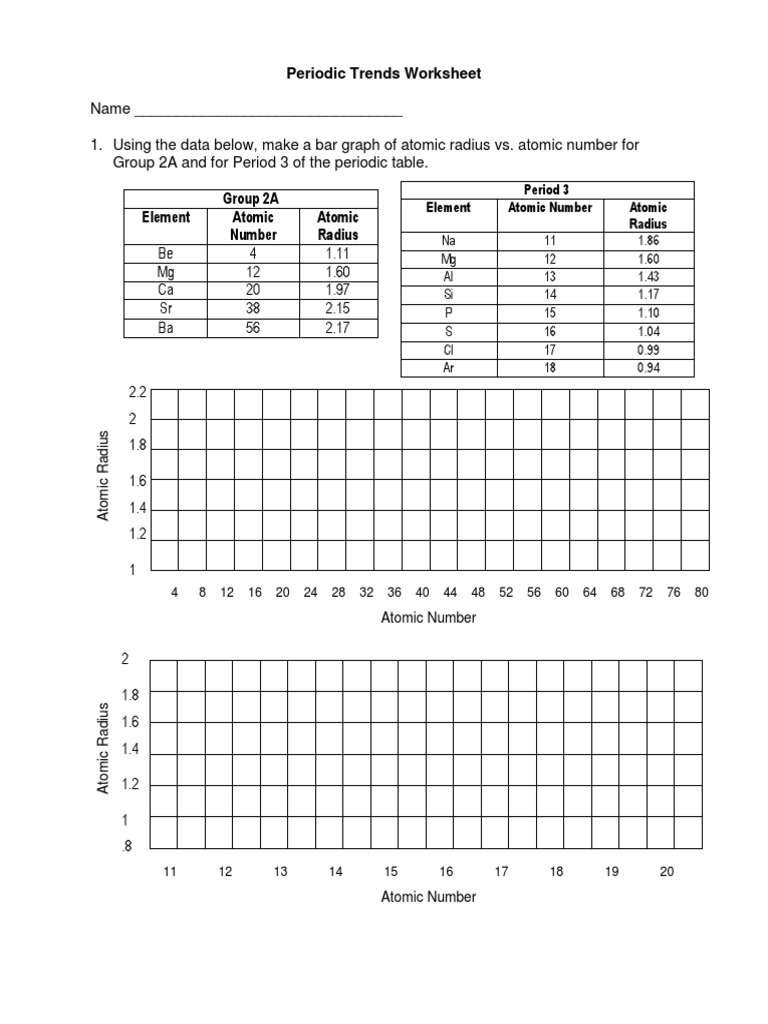 Periodic Trends Worksheet Atomic Radius 1. Using the data below, make a bar graph of atomic radius vs. atomic number for Group 2A and for Period 3 of the periodic table. 2 Group 2A Element Atomic Number Atomic Radius Be 4 1.11 Mg 12 1.60 Ca 20 1.97 Sr 38 2.15 Ba 56 2.17 Atomic Radius Atomic Number