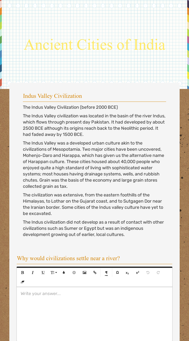 Ancient India, Indus Valley Civilization, Interactive Quiz Questions and Answers. What is the Indus Valley Civilization? When did this civilization exist? Along what river did these ancient people build their cities? Why did they build their homes and cities near a river? Harappa and Mohenjo-Daro are located in what modern day country?