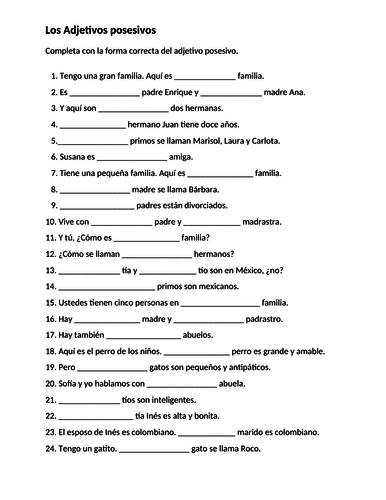 Aug 20, 2015 — A quick worksheet explaining the possessive adjectives and then 20 ... Subject: Spanish. Age range: 11-14. Resource type: Worksheet/Activity. Rating: 5 · 4 reviews · Free · In stock