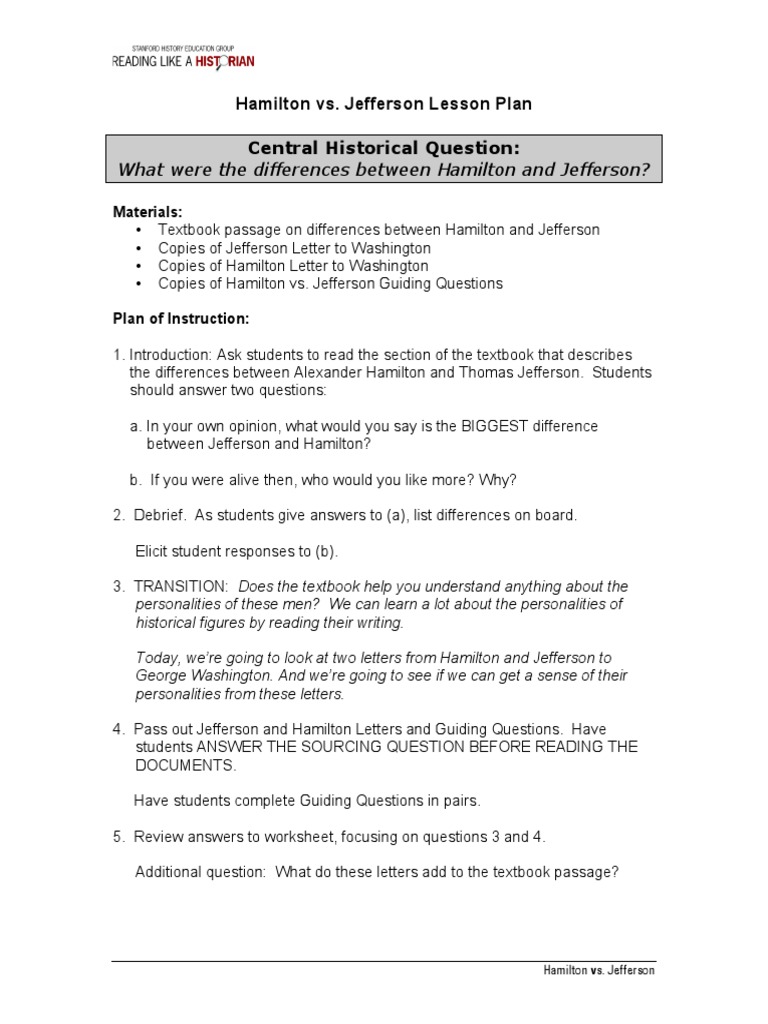 hamilton vs. jefferson worksheet Terms in this set (14) hamilton loose construction jefferson strict construsction hamilton devised a bank with right to establish branches in different parts of the country jefferson did not want a national bank, thought it unconstitutional, afraid of control by the north hamilton