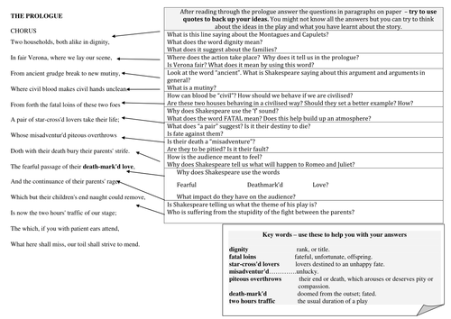 Romeo & Juliet: Lesson Resources on The Prologue. A PowerPoint and worksheet to explain the Prologue for Shakespeare's Romeo & Juliet and give the students the opportunity to 'translate&' each line into modern English.