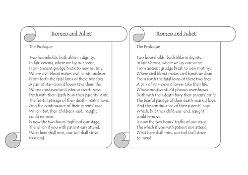 FREE RESOURCES - Romeo and Juliet – The Prologue ‘Romeo and Juliet – The Prologue’ focuses on general understanding and Shakespeare’s use of language. The resource is made up of 4 parts. - Prologue Perfection – A fun starter in which students use their knowledge of the play and rhythm and rhyme to rearrange the prologue into the correct order