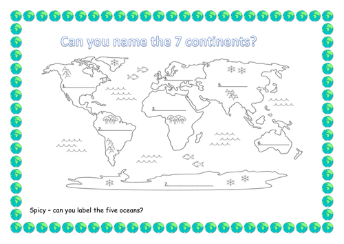 Continents and Oceans Worksheets - Free Word... - itsybitsyfun.com 7 Continents and 5 Oceans Worksheets. If you would like to include the newest ocean - the Southern Ocean these set of worksheets are for you. 7 Continents and 4 Oceans Worksheets. If your kids learn about 4 oceans this pack is perfect. You can also combine this pack with the 5 ocean... 5 oceans and 7 continents? - Answers 5 oceans-pacific ocean, Arctic ocean, Atlantic ocean, Indian ocean and southern ocean 7 continents- north america,south america, Asia, Africa, Europe oceans are water and continents are land... A 7 letter word where paleontologists noticed that these were the same on different continents even... KS1 Continents Worksheets & Activities - Geography Resources The Five Oceans Labelling Map Worksheet. 4.9 (20 reviews). With labelling activities focused on the Seven Continents and the Five Oceans as well as more detailed maps and information on Europe, the Mediterranean, Africa and South America, our resources here are created in line with the National... Map study guide.pdf a) positioning and labeling the seven continents and five oceans to create a world map; b) using the equator and prime meridian to identify the Northern,.5 pages