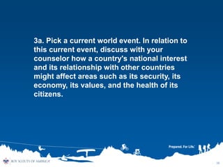 Citizenship in the World - usscouts.org Citizenship in the World - Merit Badge Workbook Page. 4 of 11 4. Do TWO of the following: a. Explain international law and how it differs from national law. Explain the role of international law and how international law can be used as a tool for conflict resolution. b. The Citizenship in the World Merit Badge: Your Ultimate ... Citizenship in the World is an Eagle-required merit badge aimed at connecting scouts to their global community. In earning the Citizenship in the World merit badge, you’ll learn about various institutions that promote world peace, the different forms of government that exist internationally, as well as ways that you can support our planet as a global citizen. Citizenship in the World - U.S. Scouting Service Project Citizenship in the World Scout's Name: _____ Citizenship in the World - Merit Badge Workbook Page. 10 of 11 c. Explain the purpose of a passport and visa for international travel. 7. Do TWO of the following (with your parent's permission) and share with your counselor what you have learned: a.