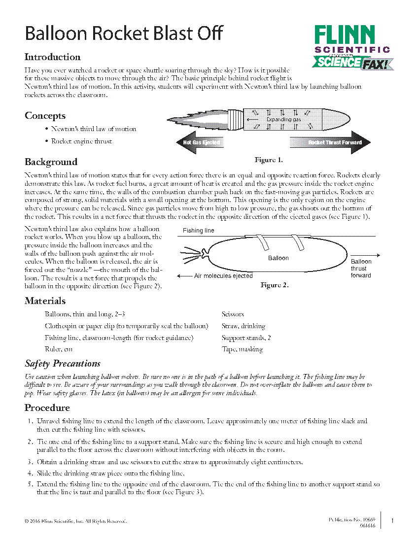 PDF Lab: Balloon Rockets and Newton's Laws - SC TRITON Science Lab: Balloon Rockets and Newton's Laws C H A P T E R 7 : N EW T O N ' S T H I R D L AW Background: A rocket's movement depends on Newton's Third Law of Motion - For every action there is an equal and opposite reaction. When a rocket blows out gas at high speed in one direction (action force), the rocket is pushed in the opposite direction ... corsi-flash-milano.it › qizzocorsi-flash-milano.it Feb 24, 2022 · email protected] Balloon Rocket Experiment Lesson Plans & Worksheets Balloon Rockets For Teachers 8th - 10th In this balloon rocket worksheet, students experiment with a balloon, clothespin, straw, string and tape to observe Newton's Third Law of Motion in action. Students explain the action force and reaction force acting in the investigation. + Lesson Planet: Curated OER Balloon Rocketry For Teachers 5th Balloon Rocket Experiment Worksheets & Teaching Resources ... In this inquiry activity you build a balloon rocket (ghost) and time it as it 'flies' across a room. you then challenge students to create a ghost using simple materials that will fly in a faster time than yours. This is a fun way to teach Newton's Third Law of Motion, but there are 2 versions of Subjects: Physics, General Science, Halloween