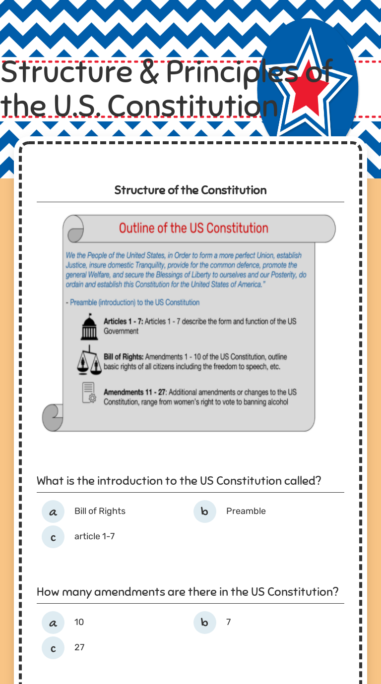 DOCX Home - National Constitution Center Class Outline and Worksheet. Overview. Part I: Text of the Constitution and Big Ideas. Part II: Founding Story: The Constitutional Convention and the Amendment Process. Part III: Examples of Constitutional Amendments Over Time. Questions to Consider. Why did the Founding generation include a formal process for amending the Constitution? The Constitution of the United States Worksheets This compilation of printable worksheets on U.S. Constitution helps children of grade 3 through grade 8 in learning the frequently used terms with the constitutional vocabulary, comprehend the seven basic principles, Preamble, Bill of Rights, amendments 11 through 27, figure out the functions of three branches of the government, understand the system of checks and balances. PDF United States Constitution Outline - For the Teachers Article 7: Ratification of the Constitution Amendments to the Constitution 1. Freedom of Religion, Speech, Press, Assembly, and Petition (1791) 2. Right to Keep Weapons (1791) 3. Protection against Quartering Soldiers (1791) 4. Freedom from Unreasonable Search and Seizure (1791) 5. Rights of Persons Accused of a Crime (1791) 6. Constitution Outline Worksheet - Fill Out and Sign ... Follow the step-by-step instructions below to eSign your constitution outline worksheet template: Select the document you want to sign and click Upload. Choose My Signature. Decide on what kind of eSignature to create. There are three variants; a typed, drawn or uploaded signature. Create your eSignature and click Ok. Press Done.