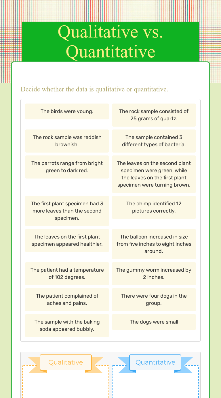 Qualitative Vs Quantitative Worksheets & Teaching ... Scientific Observation: Qualitative vs Quantitative Intro, & Sort- DIGITAL! by. Scienceisfun. 73. $3.00. PDF. Teach, practice and even assess with this lesson on Quantitative vs. Qualitative observations. Included are notes, practice examples an activity (that can be done at home) and a sorting sheet are all included.