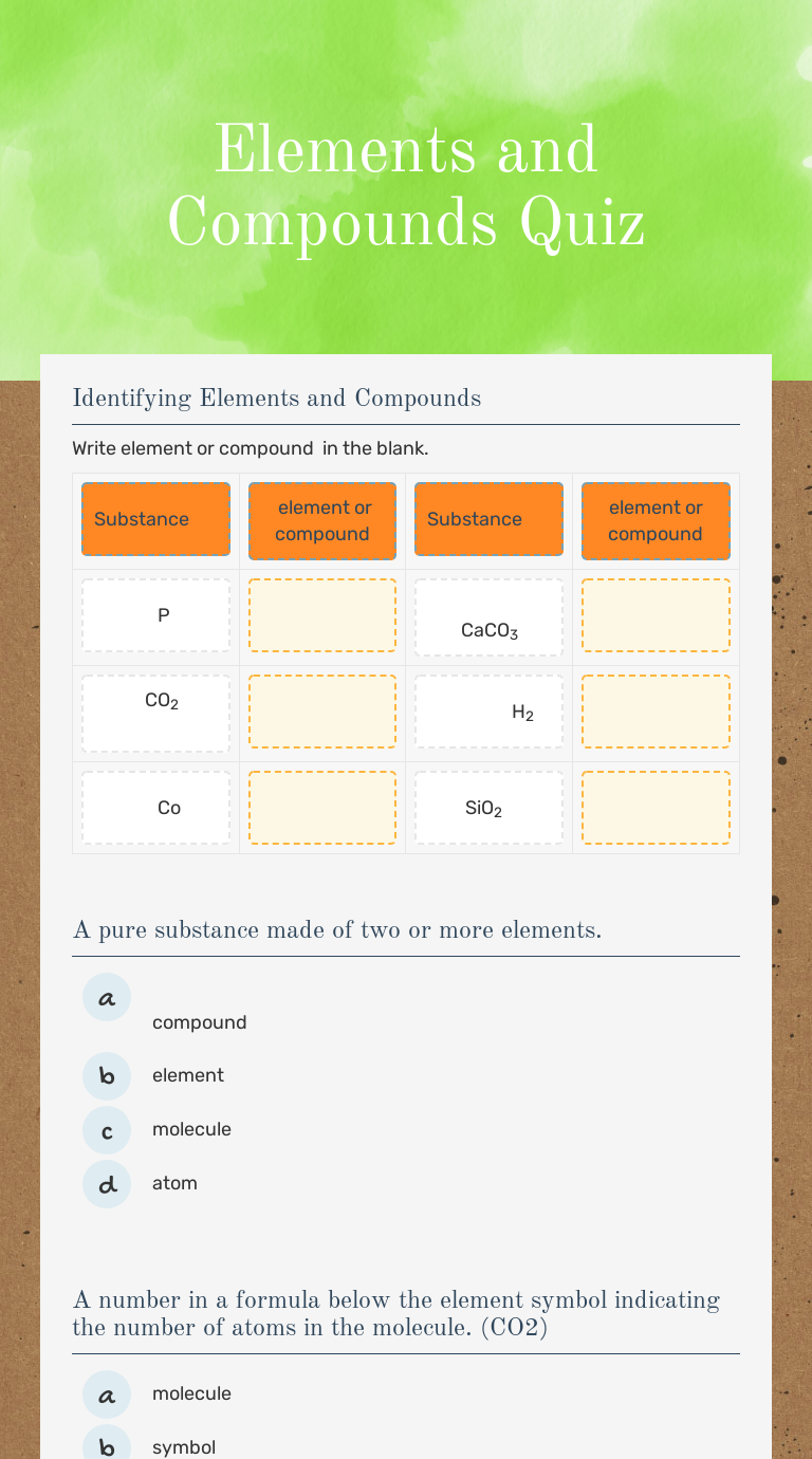 Compounds And Elements Worksheets & Teaching Resources | TpT Results 1 - 24 of 14000+ ... Atoms, Molecules, Elements & Compounds Worksheet ... Also included in: Middle School Science Curriculum - Complete 5E Bundle ...