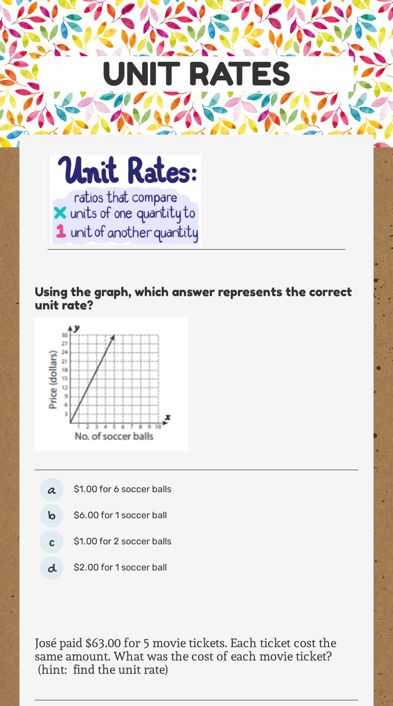 Quiz & Worksheet - Finding the Unit Rate | Study.com Determining the unit rate The use of unit rates for non-time factors Skills Practiced. Use these skills with this quiz and worksheet: Interpreting information - analyze a given problem and ...