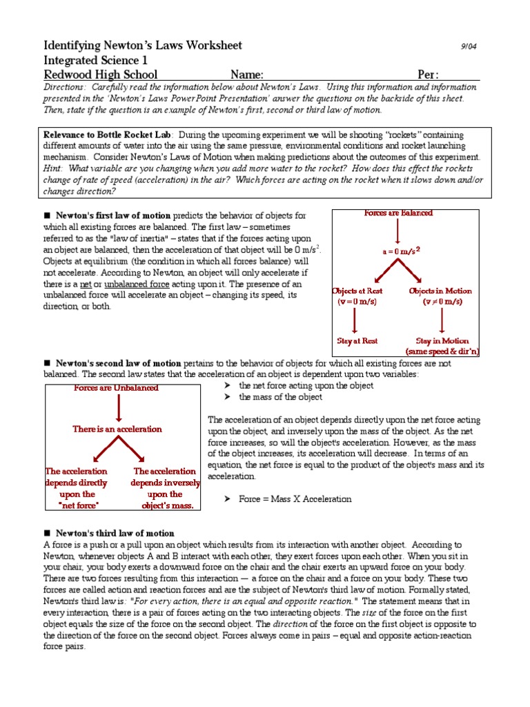 Newton's second law worksheet answers. KEY NEWTON'S LAWS WORKSHEET KEY. Period: KEY. NEWTON'S LAWS WORKSHEET - KEY. I. NEWTON'S FIRST LAW OF MOTION ... Newton's second law of mojon is also known as the LAW OF ACCELERATION.4 pages jh.gatesvilleisd.org › 54832281 › wkst-newtons_second_lawNewton’s Second Law of Motion Problems Worksheet Mar 10, 2015 · Newton’s Second Law of Motion Problems Worksheet Newton’s Second Law of Motion, sometimes called the law of force and motion or law of acceleration, states that: An object acted on by an unbalanced force will accelerate in the direction of that force, in direct proportion to the strength of the force, and in inverse proportion to the mass Physics Classroom Elephant Answers Newton's Second Law. Read from Lesson 3 of the Newton's Laws chapter at The Physics Classroom: pages Applying Newton's Laws of Motion Select the correct ailswer (a, b, or c) and justifu your answer. ... Newton's second law states that the acceleration of an object is directly related to ...6 pages
