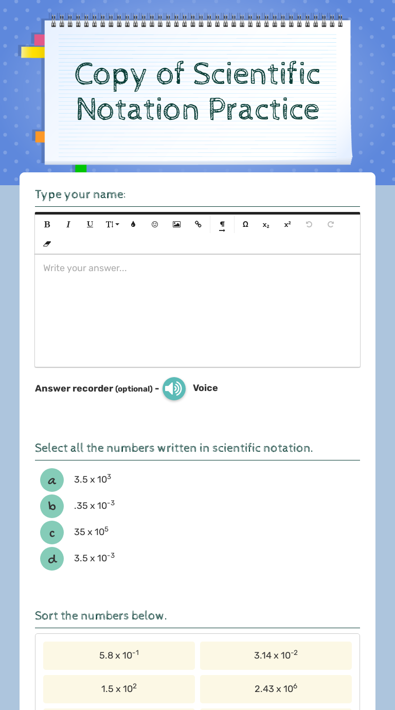 Scientific Notation Worksheet With Answers Scientific Notation Worksheet With Answers Scientific Notation Worksheet With Answers October 24, 2021 admin Did you apperceive you can accumulate and bisect numbers in accurate notation? This algebraic worksheet starts with a accessible addition with step-by-step instructions for adding and adding numbers in accurate notation. Free Printable Math Worksheets for Pre-Algebra Free Pre-Algebra worksheets created with Infinite Pre-Algebra. Printable in convenient PDF format. Gizmo Student Exploration Periodic Trends Answers ... 27/10/2021 · Student exploration gizmo answer key. You might be interested in. Student Exploration Balancing Chemical Equations Activity A Chemical Equation Equations Chemical The answer is the first option just took the test.Gizmo student exploration periodic trends answers. View these properties on the whole periodic table to see how they vary across periods and … Answer Key Scientific Notation Practice Worksheet ... Ordering numbers in scientific notation worksheet pdf. Create your own worksheets like this one with infinite algebra 1. Scientific method practice worksheet answer key. Thus its 2 011 x 10 5 the answer is in the negative because the decimal moved left. 6 452 x 102. Each sheet is scaffolder and has model problems explained step by step.