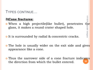 Radial Fracture - A crack in a gloss that extends outward like the spoke of a wheel from the point at which the glass was struck. Concentric Fracture - A crack in a glass that forms a rough circle. Often it is difficult to determine just from the size and shape of a hole in glass whether it was made by a bullet or by some other projectile.