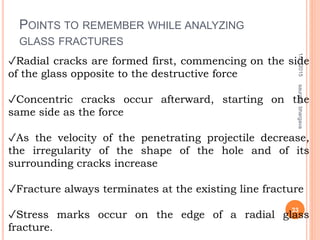 Glass Fracture Patterns + Forensics Glass Anaylysis ... Start studying Glass Fracture Patterns + Forensics Glass Anaylysis. Learn vocabulary, terms, and more with flashcards, games, and other study tools.