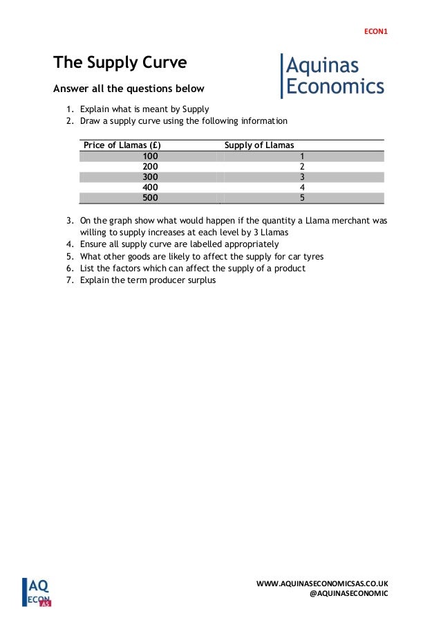 PDF Econ Supply Curve Worksheet Econ Supply Curve Worksheet Chapter 5 For each problem, answer the question then illustrate the change that will occur on the graph below. First draw the original supply line and label it "S". Then draw the new supply line and label it "S1". 1. Sony purchases new technology that will allow more Playstation 3s to be produced each hour. Demand and Supply: Practice Questions and Answers - Eduspred Answer 1: Demand refers to the willingness and ability of buyers, not just willingness. Supply - Quizlet Supply. the desire and ability to produce and sell a product. Law of supply. when prices decrease quantity supplied decreases; when prices increase quantity supplied increases. Supply schedule. lists how much a good or service an individual producer is willing and able to offer for sale at each price. Market supply schedule. Ap micro unit 2 practice mc questions - StuDocu Producer surplus is the: A. Area under the supply curve to the left of the amount sold. B. Area under the supply curve to the right of the amount sold. C. Amount the seller is paid plus the cost of production. D. Amount the seller is paid less the cost of production. E. Cost to sellers of participating in a market.