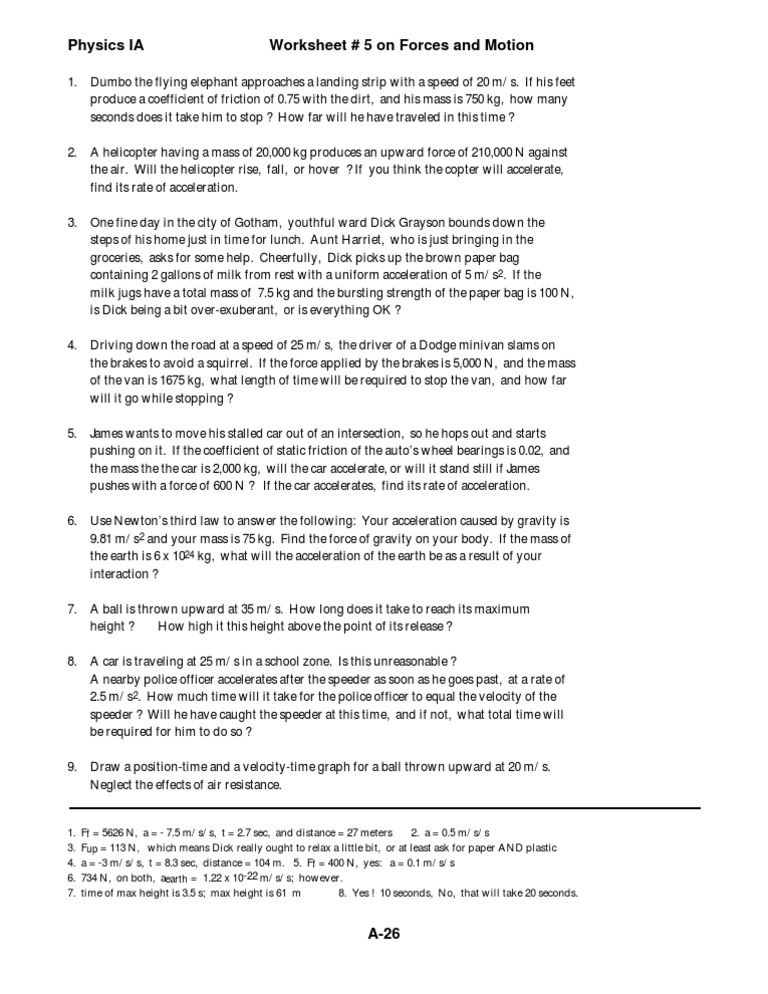 DOC Physical Science Motion and Forces Worksheet Physical Science Motion and Forces Worksheet 1. What is the force on an object that goes from 35 m/s to 85 m/s in 20 seconds and has a mass of 148 kg? 2. Calculate the force on an object that has a mass of 12 kg and an acceleration of 4 m/s2 . 3. During a race, a sprinter increases from 5.0 m/s to 7.5 m/s over a period of 1.25 s. Forces And Motion Worksheet Aug 21, 2021 · Forces And Motion Worksheet August 21, 2021 admin Discover a above allotment of physics as you apprentice about force: friction. Catered to additional graders, this science worksheet challenges acceptance to administer the abstraction of abrasion and how it resists motion. When a affective article encounters friction, it slows down.
