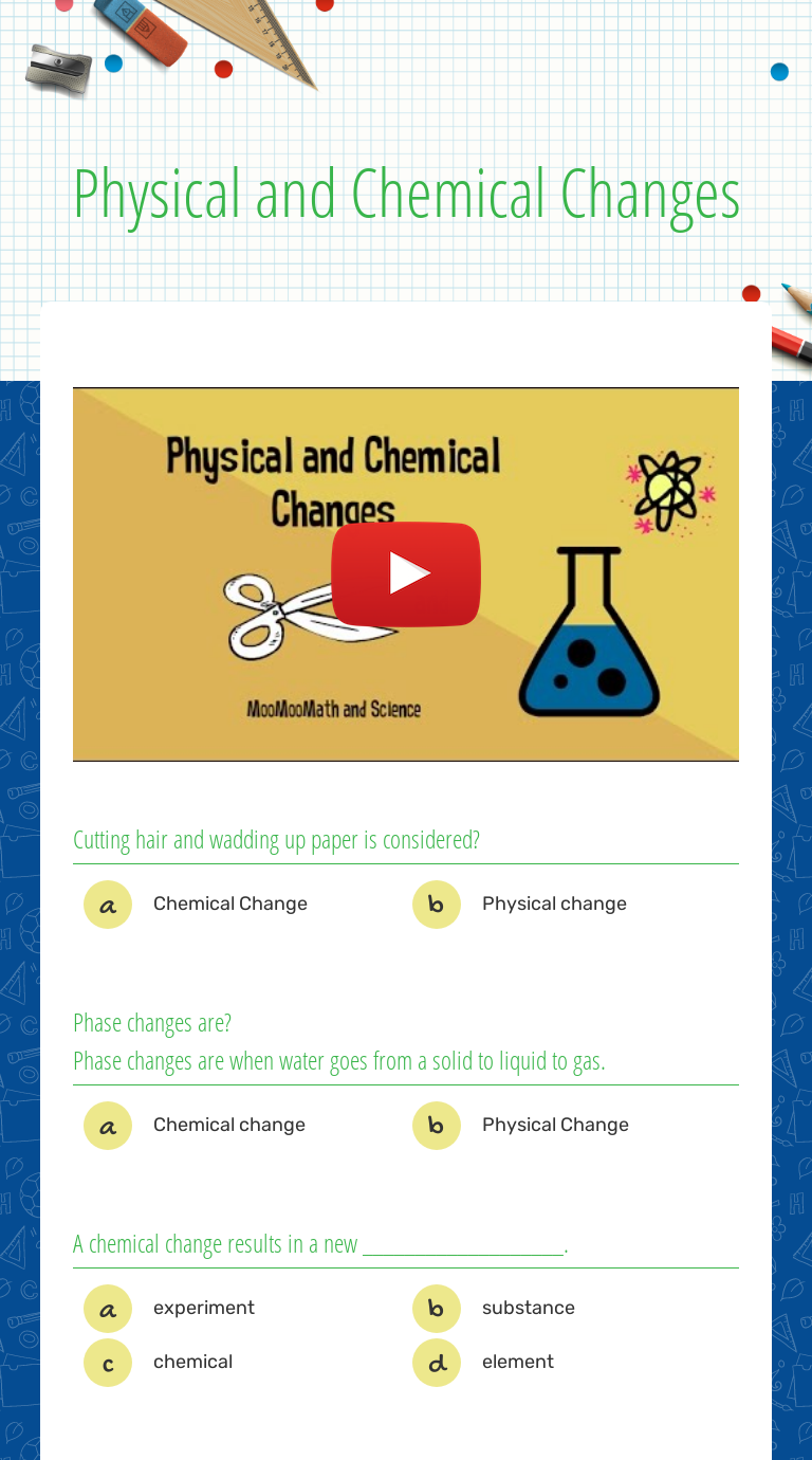 Physical and Chemical Changes interactive worksheet for 7 Live worksheets > English > Science > Physical and Chemical Changes > Physical and Chemical Changes. Physical and Chemical Changesphysical and chemical changes. ID: 1519201. Language: English. School subject: Science. Grade/level: 7. Age: 11-13. Main content: Physical and Chemical Changes. Other contents: