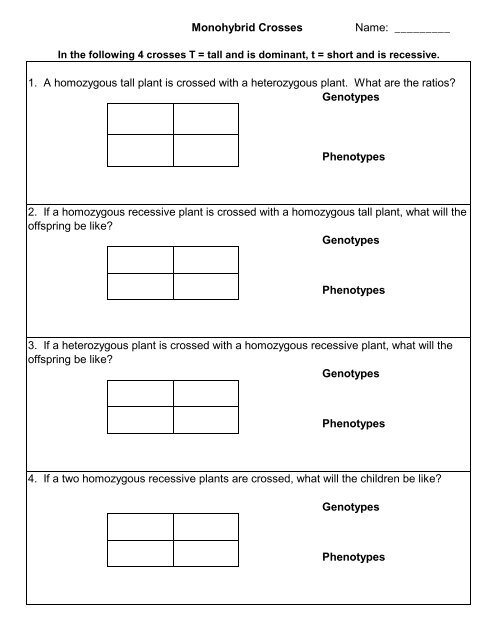 Practice Monohybrid Crosses Worksheet Answers - XpCourse Displaying top 8 worksheets found for - Monohybrid Cross Practice 1. Some of the worksheets for this concept are Monohybrid crosses work answers, Genetics work, Genetics work, Mendelian genetics, Genetic crosses work answer key, Bikini bottom genetics name, Dihybrid cross work with answers, Practice problems on dihybrid with answer keys. More ›