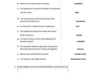 Metallic Bonding, Structure and Properties Worksheet A comprehensive answer sheet The resource encompasses the following areas: Metallic bonding structure with labelling exercise Discussion on electrostatic forces The properties and structure of alloys and pure metals Key metal properties with bonding explanations Comparisons between group 1 and transition metal properties