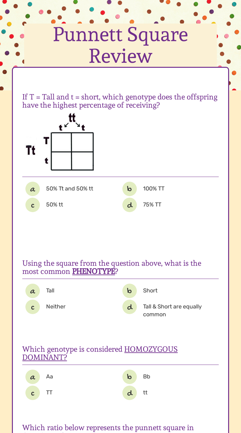 Punnett Square Worksheets: Free Genetics Lesson Plans - NGSS life science In this Punnett square worksheet, students will learn about human genetic disorders for autosomal, sex-linked, pleiotropy, and incomplete dominant traits. Students will cross different parental genotypes and determine the offspring genotype, phenotype, and probabilities of having the genetic disorder and being a carrier of the genetic disorder. Worksheet Punnett Square Review Answers - SAFS & EFFS Punnett Square Review Worksheets & Teaching Resources | TpT Here is a quick way to assess student knowledge of Punnett Squares with a science digital quiz. This Punnett Square Quiz contains 10 multiple choice questions and uses Google Forms to self-grade. The feedback is immediate for the students and for the teacher.