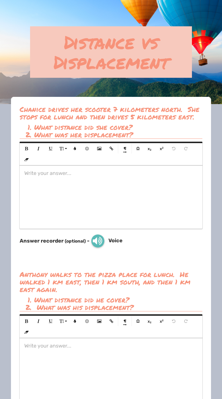 Distance vs displacement worksheet. Physlet Physics by Christian and Belloni: Illustration 2.1 In physics we often talk about distance traveled and displacement to describe how the position of an object changes. Sometimes we even (appear to) use these terms interchangeably. However, they are not necessarily the same. Distance traveled is just that: the distance an object travels. The displacement of an object is a comparison of the final position to the initial position: Δx = x … Solving for time (video) | Khan Academy Let's work through another few scenarios involving displacement, velocity, and time, or distance, rate, and time. So over here we have, Ben is running at a constant velocity of three 3 meters per second to the east. And just as a review, this is a vector quantity. They're giving us the magnitude and the direction. If they just said 3 meters per second, then that would just be speed. So this is ... Distance vs Time Graph Worksheet - sfponline.org Distance Vs Time Graphs Worksheet and Activity Author: Subject: Distance vs Time Graphs in Math Keywords: graph, distance vs time Created Date: 10/12/2010 8:27:30 AM ... Microsoft is building an Xbox mobile gaming store to take on … 19 oct. 2022 · Microsoft’s Activision Blizzard deal is key to the company’s mobile gaming efforts. Microsoft is quietly building a mobile Xbox store that will rely on Activision and King games.