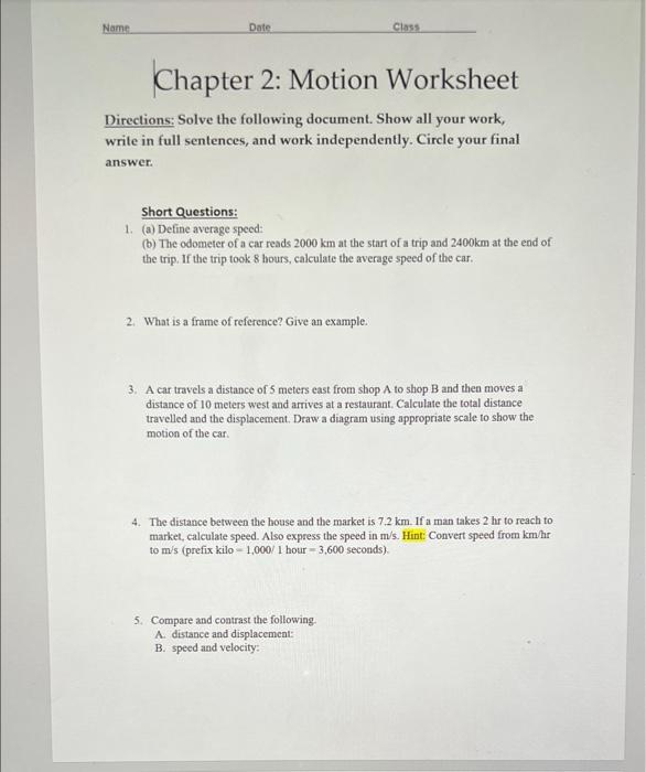 Physics distance and displacement worksheet answers. Work Power and Energy worksheet with Answers-Physics About In this case, we define the work done by the force on the particle as the product of the component of the force along the line of motion and the magnitude of the displacement S. Sometimes force and displacement do not have the same direction. Here the force F is making an angle θ with the surface on which the body is moved. Work and Energy Review - with Answers #1 - Physics Classroom FALSE - Since Superman does not cause a displacement, no work is done; he is merely holding the car to prevent its descent down the hill. g. FALSE - The upward force does not cause the horizontal displacement so this is a NON-example of work. h. TRUE - There is a component of force in the direction of displacement and so this is an example of ... Kinematic Equations: Sample Problems and Solutions - Physics … Kinematic equations relate the variables of motion to one another. Each equation contains four variables. The variables include acceleration (a), time (t), displacement (d), final velocity (vf), and initial velocity (vi). If values of three variables are known, then the others can be calculated using the equations. This page demonstrates the process with 20 sample problems and … HyperPhysics - GSU An active exploration in physics will typically lead you to something which needs to be quantified, and it is hoped that the many Javascript-enabled calculations will provide many opportunities to answer "What if .." type questions. New content for HyperPhysics will be posted as it is developed. The intent is to maintain the entire HyperPhysics ...