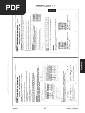 Glencoe Precalculus Chapter 10 Answers - myilibrary.org Answers Answers (Lesson 1-3) PDF 2nd Glencoe precalculus answers chapter 1. . . 16 Glencoe Precalculus Study Guide and Intervention Continuity, End Behavior, and Limits Continuity A function f (x) is continuous at x removable = f c if it satisfies the... precalculus chapter 1 answers Chapter 1 - Functions
