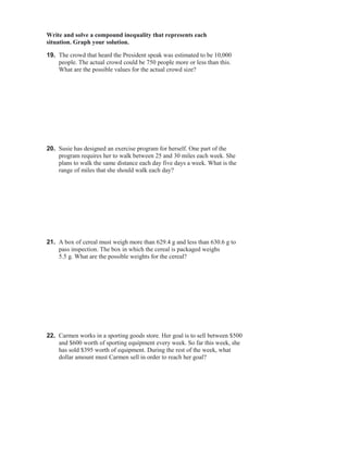 PDF Compound inequalities word problems worksheet pdf Compound inequalities word problems worksheet pdf You want your pay this week to be at least 100. M z2 y0r152 w vklu ot2a z ysnovf 8tcw za zr ul 1c al q la hlxlk ir pimgkhptis f 0r2e 9s9e5rtvue wdu3 g umna4d iem jw 6izt shp fnsf oisnbi4t 0e5 qaplkgie kbja Word problems for inequalities 7 Word A composite inequality is the combination of two or more
