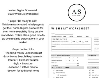 Home buyer wish list worksheet. Wishlist Worksheet - Main Line Real Estate Mary Beth Hurtado 610-608-3119 Creating a Wish List Worksheet Divide your wish list into three categories: Interior, Exterior and General. The Interior category needs to list everything you want inside your home. Remember, a home is a long-term investment. It's a good idea to think ahead 5, 10 or even 20 years and evaluate whether your family will grow during that time. Publication 550 (2021), Investment Income and Expenses ... Comments and suggestions. We welcome your comments about this publication and suggestions for future editions. You can send us comments through IRS.gov/FormComments.Or, you can write to the Internal Revenue Service, Tax Forms and Publications, 1111 Constitution Ave. NW, IR-6526, Washington, DC 20224. Home Buying Wishlist - Weichert Amid all the excitement involved in buying a house, a home buying wishlist will help to organize your thoughts. It's helpful to think of your requirements in three columns - needs, wants and wishes. Needs are features that are must-haves. Wants are amenities that may not be must-haves, but are key factors in your decision-making process. PDF Home Features Wish List Home Features Wish List Use this worksheet to rank the importance of features you would want in your new home, then share it with your real estate agent so they can more easily find homes that could be a fit for you. Characteristics or Features Details on Preferences 1 Poor — 5 Excellent Community/Location 1.
