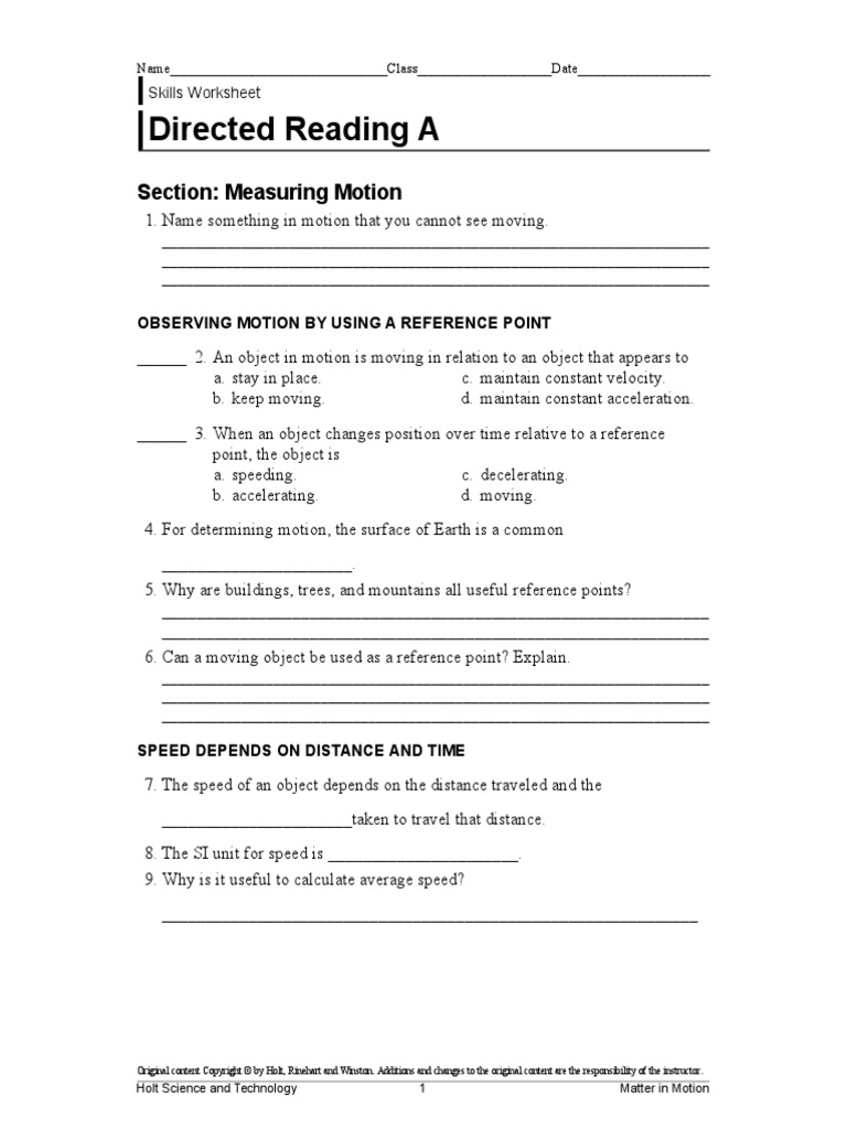 PDF Skills Worksheet Directed Reading A - GO GRIZZLIES! Directed Reading A SECTION: WHAT IS MATTER? 1. B 2. D 3. They are all made of matter. 4. Matter is anything that has mass and takes up space. 5. Volume is the amount of space taken up by an object. 6. volume 7. meniscus 8. length, width, and height 9. cubic 10. Answers will vary. Sample answer: The volume could be measured by placing the nugget ... PDF Skills Worksheet Directed Reading A - westerville.k12.oh.us Directed Reading A continued Identify the correct bacteria kingdom for the organisms described below by writing Archaebacteria or Eubacteria in the space provided. 10. Some of these live inside humans. 11. One of these causes pneumonia. 12. These live in places where most other organisms could not live. 13. Its name comes from a word that means ...