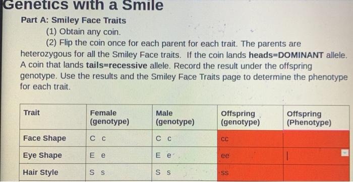 PDF Genetics with a Smile Name Part A: Smiley Face Traits - Science Spot Genetics with a Smile Name _____ Part A: Smiley Face Traits (1) Obtain two coins from your teacher. Mark one coin with a "F" and the other with a "M" to represent each of the parents. The parents are heterozygous for all the Smiley Face traits. (2) Flip the coins for parent for each trait.