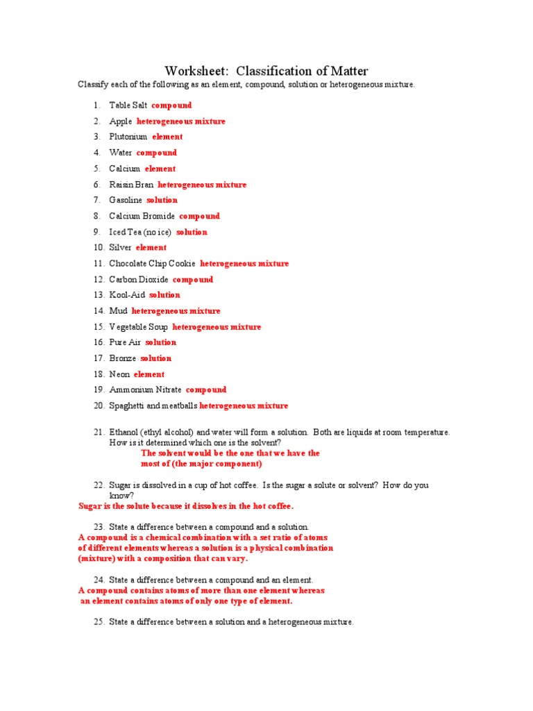 Classifying Matter ANSWERS Worksheet 2.doc - Google Docs Chemistry: Classifying Matter 1. Define matter, pure, mixture, element, compound, solution and mechanical mixture. 2. Classify each of the materials below. In the center column, state whether the material is a pure substance or a mixture.If the material is a pure substance, further classify it as either an element or compound in the right column. . Similarly, if the material is a mixture ... Chemistry Classifying Matter Worksheet Answer Key Become an Expert on Chemistry Classifying Matter Worksheet Answer Key by Watching These 5 Videos › teachers › teaching-toolsTeaching Tools | Resources for Teachers from Scholastic Book List. 20+ Read-Alouds to Teach Your Students About Gratitude. Grades PreK - 5 Foundations of Chemistry - Classifying Matter - Lesson 1 ... - Quizlet Anything that has mass and takes up space (volume) Atom. A small particle that is a building block of matter. Substance. Matter with a composition that is always the same. Element. A substance that consists of just one type of atom. Compound. A type of substance containing atoms of two or more different elements that are chemically bonded together.