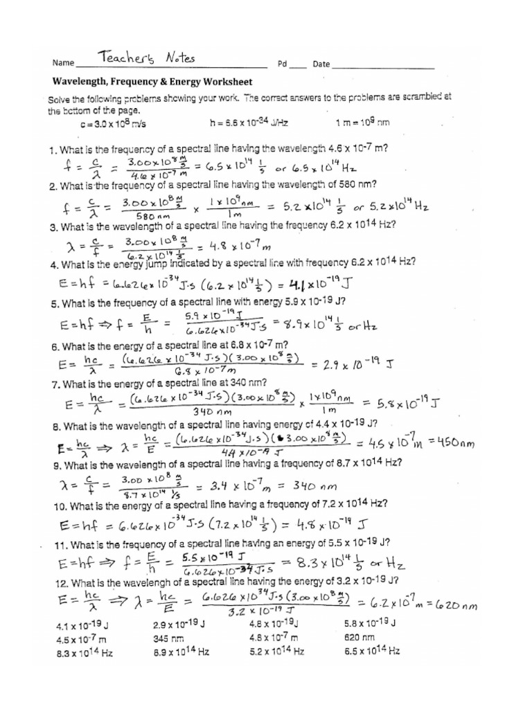 Wavelength Frequency and Energy Worksheet Answers | PDF - Scribd Wavelength Frequency and Energy Worksheet Answers - Free download as PDF File (.pdf) or read online for free. 44. 44. Open navigation menu. ... Save Save Wavelength Frequency and Energy Worksheet Answers For Later. 100% (1) 100% found this document useful (1 vote) 365 views 2 pages.