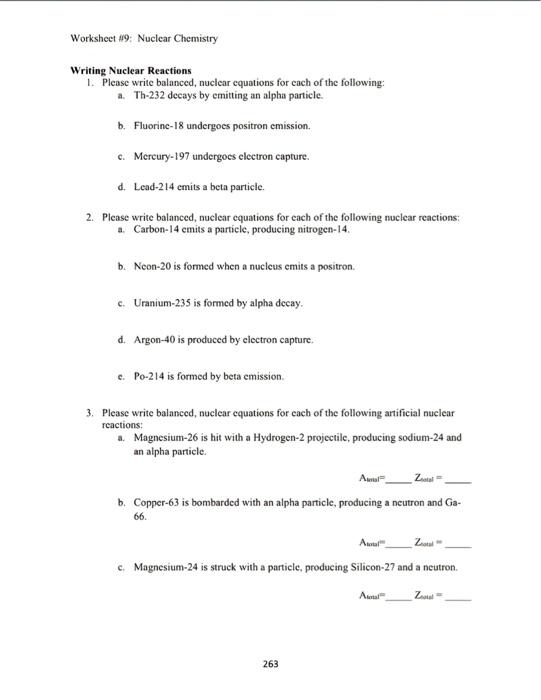 The alpha decay of radon-198 Nuclear Chemistry Worksheet. Using your knowledge of nuclear chemistry, write the equations for the following processes: ... The beta decay of uranium-237.
