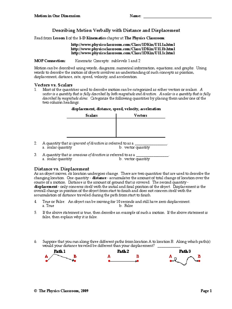 Motion in One Dimension worksheets | eduTOOLBOX Motion in One Dimension worksheets Fourteen classroom handouts for student practice on one-dimensional kinematics: Describing Motion Verbally with Distance and Displacement Describing Motion Verbally with Speed and Velocity Acceleration Describing Motion with Diagrams Describing Motion Numerically Describing Motion with Position-Time Graphs