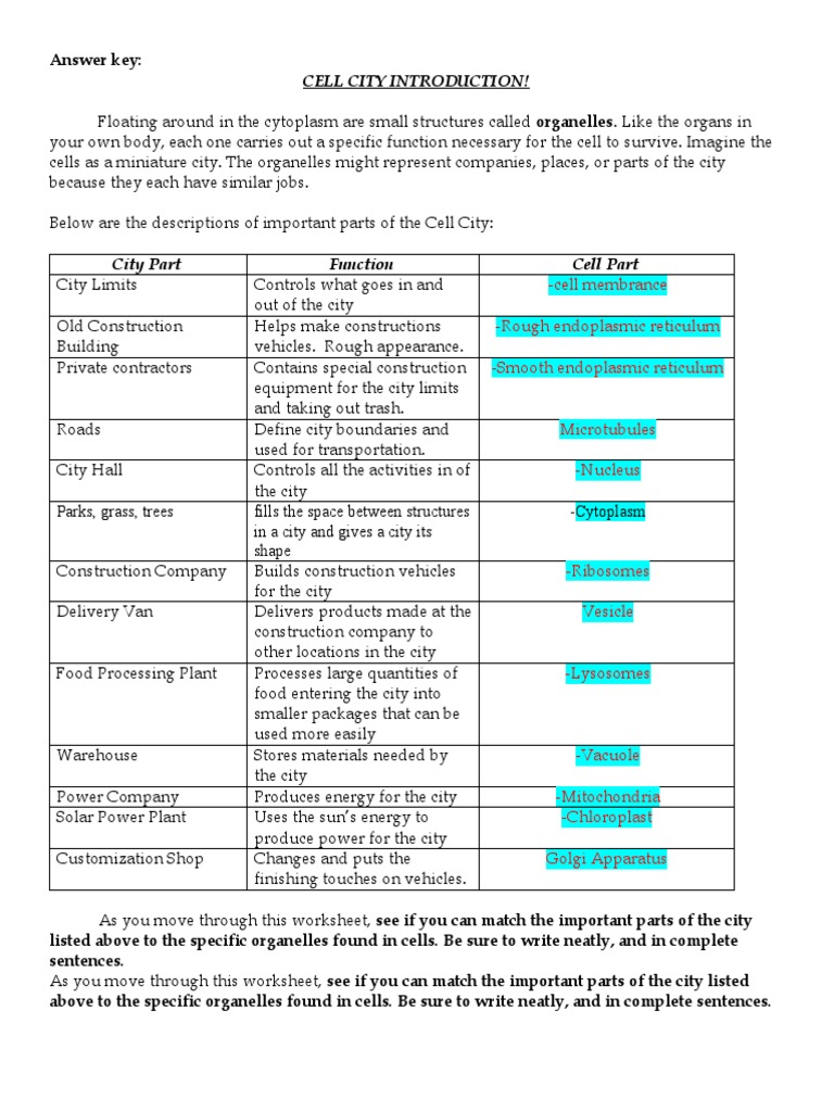 PDF Cell City Worksheet Answer Key - Johns Hopkins University The nucleus controls all of the activities of the cell as city hall controls all the activities in of the city. 2. The cell membrane is a thin, flexible envelope that surrounds the cell. It allows the cell to change shape and controls what goes into and out of the cell a. What company or place does the cell membrane resemble in a Cell City ...