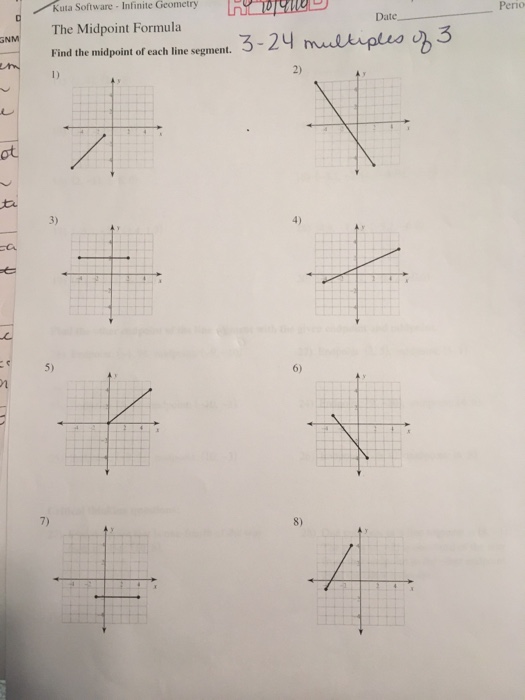 3-The Midpoint Formula - Kuta Software Find the midpoint of each line segment. 1) x y −4 −2 2 4 −4 −2 2 4 2) x ... deQ Hwpi Ft phW GIanBfIi9nEi st 3ep kG FewohmbeFtxr nyM.O Worksheet by Kuta ... Midpoint Formula Worksheets - Math Worksheets 4 Kids Midpoint formula worksheets have a wide range of high school practice pdfs to find the midpoint of a line segment using number lines, grids and midpoint formula method. Also determine the missing coordinates, midpoint of the sides or diagonals of the given geometrical shapes, missing endpoints and more. Free pdf worksheets are also included.