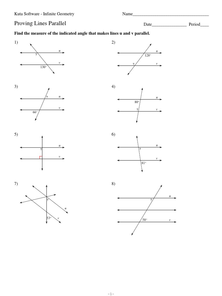 Proving Lines Parallel - Kuta Software Proving Lines Parallel Date_____ Period____ Find the measure of the indicated angle that makes lines u and v parallel. 1) u v? 130 ° 130 ° ... Create your own worksheets like this one with Infinite Geometry. Free trial available at KutaSoftware.com. Title: 3-Proving Lines Parallel