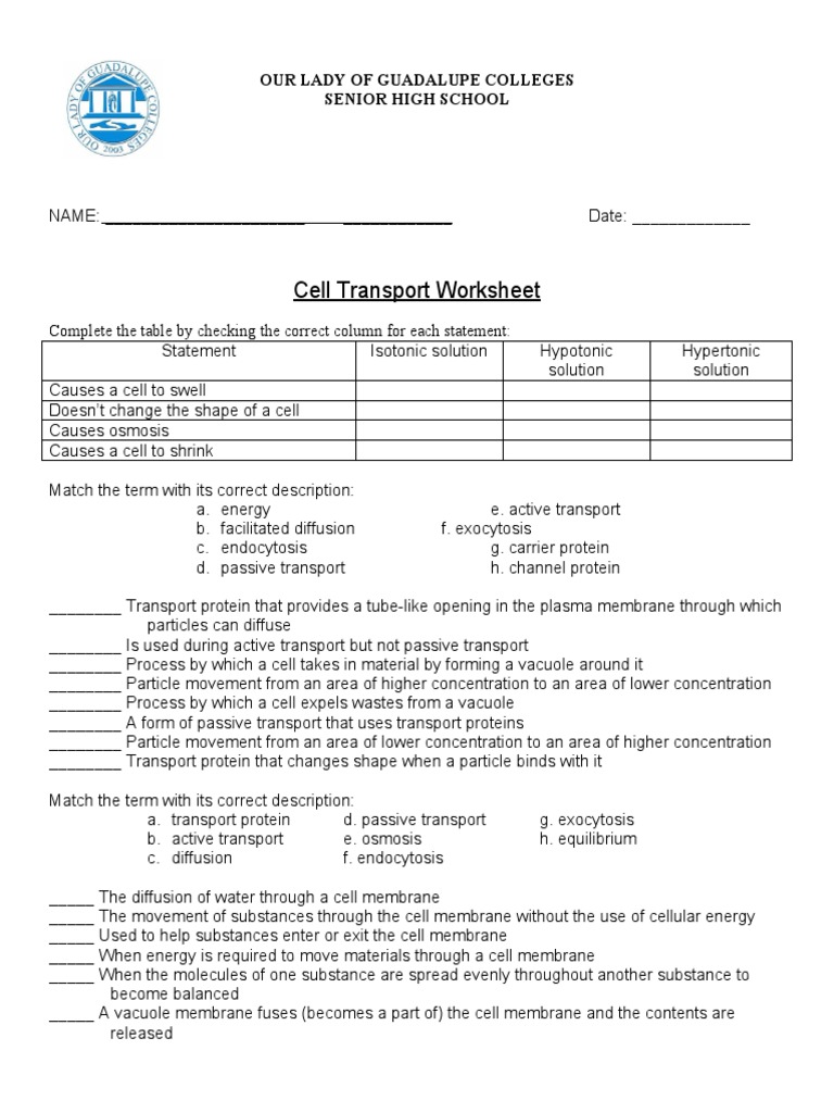 PDF Chapter 7.3 GUIDED READING KEY - isd2135.k12.mn.us The bulk transport of large molecules and clumps of materials into and out of cells occurs by movements of the cell membrane, which require energy. Passive Transport For Questions 1—4, write the letter of the correct answer on the line at the left. 1. of the following must be tille for diffusion to occur? PDF PassiveTransport&Worksheet& - Garzzillo Science Part4:!Match!thedefinition!to!theterms!in!theword!bank.!Words!maybeused!morethan!once!! 1. _____Theswelling!and!bursting!of!animal!cellswhenwaterentersiscalled ?! 2 ...