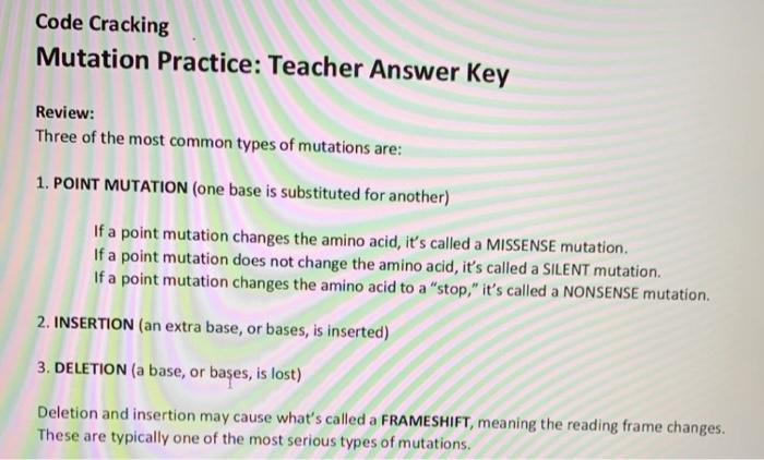 Dna Mutations Practice Answer Key - Printable Worksheets Some of the worksheets displayed are Mutations work key, Deletion insertion frameshift point mutation changes, Work mutations practice, Code cracking mutation practice teacher answer key, Mutation answer key, Work mutations practice answers, Mutations practice work answers acecad, Dna and genes answer key.