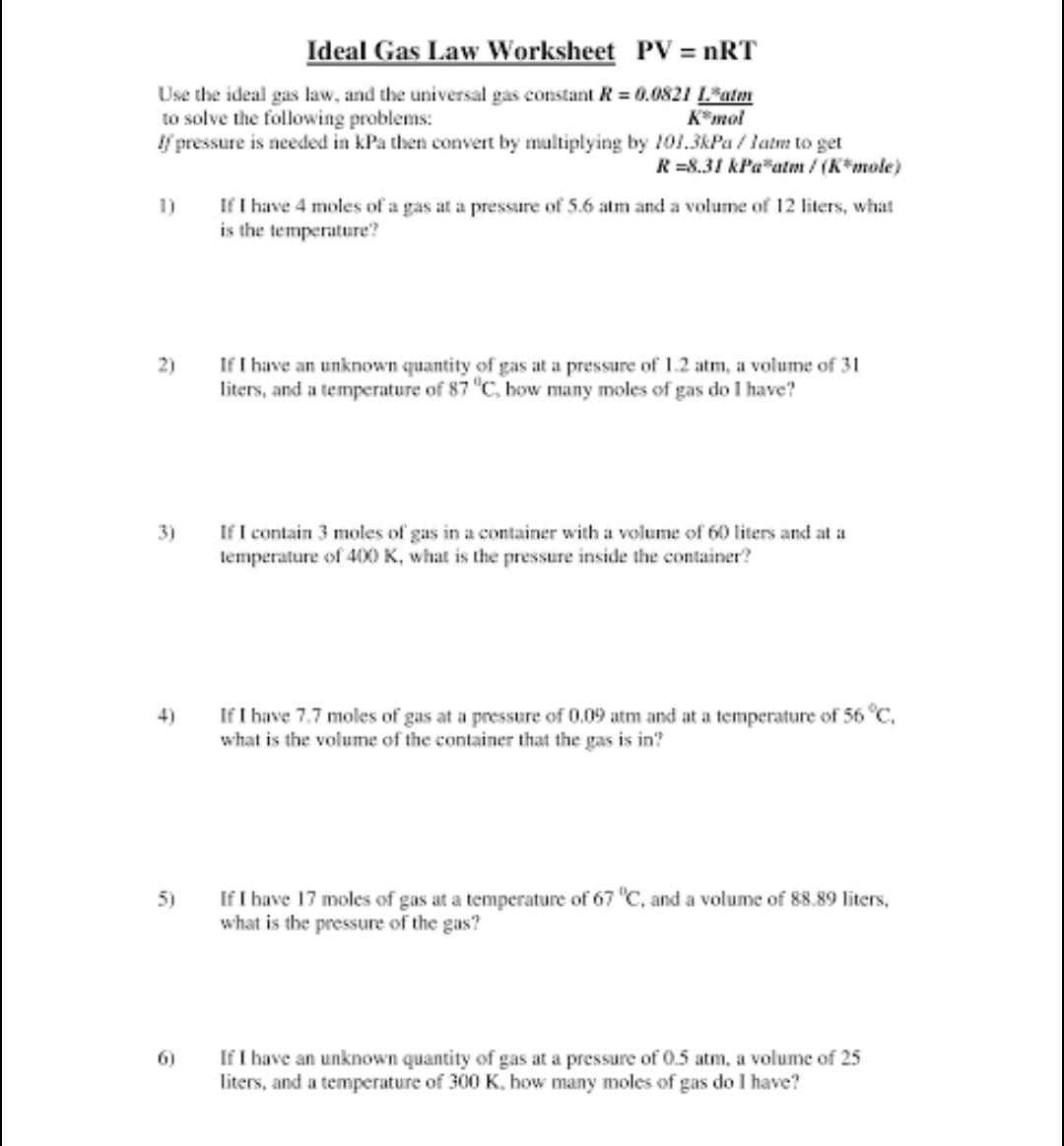 Gas Laws 1 (Worksheet) - Chemistry LibreTexts This page titled Gas Laws 1 (Worksheet) is shared under a CC BY-NC-SA 4.0 license and was authored, remixed, and/or curated by Mark Draganjac via source content that was edited to the style and standards of the LibreTexts platform; a detailed edit history is available upon request. Back to top Formulas & Masses (Worksheets) Solutions