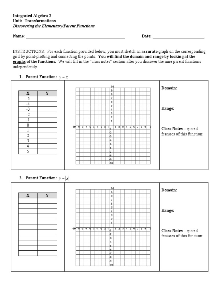 Algebra 2 Parent Functions And Transformations Worksheet Remember the basic concepts of combining transformations Step 1: Translate the graph horizontally h units. Step 2: Use "a" to stretch or shrink the graph from step 1. Step 3: Mirror the graph from step 2 when a<0 (when a is negative). Step 4: Translate the graph of step 3 vertically by k units. 14 Example 4 Suppose g (x) = -2|x - 1| + 3. Parent Functions And Transformations - Education Is Around Parent Functions And Transformations Worksheet As mentioned above, each family of functions has a parent function. A parent function is the simplest function that still satisfies the definition of a certain type of function. For example, when we think of the linear functions which make up a family of functions, the parent function would be y = x. Parent Functions And Transformations Worksheet - Martin Lindelof Parent functions and transformations worksheet, word docs, & powerpoints.Parent functions and transformations worksheet, word docs, & powerpoints. Worksheets are transformations of graphs date period, algebra ii translations on parent functions review,. Use the graph of parent Parent Functions And Transformations Worksheet (With Answer key + pdf ... Instructions on how to use "Parent Functions And Transformations Worksheet (With Answers pdf)" Use this worksheet to enhance your ability to determine the parent functions and transformations. A 5-item math drill activity will be given to the learners to determine the graph, parent functions and transformations.