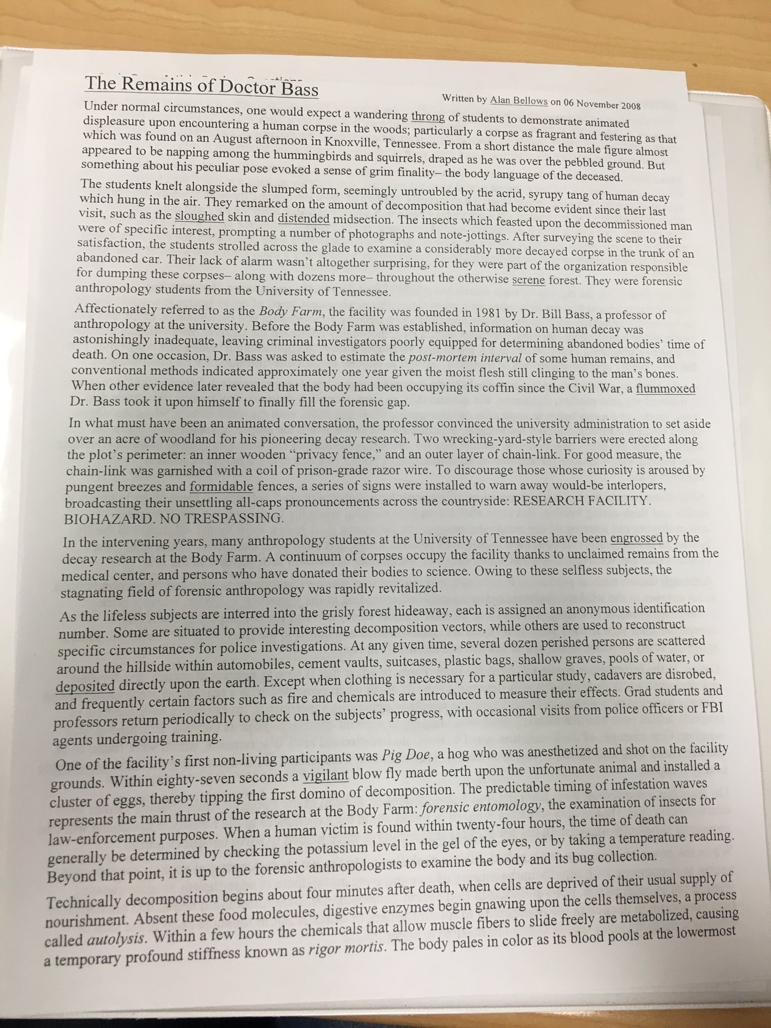 The Remains of Doctor Bass 6 Nov 2008 — They were forensic anthropology students from the University of. Tennessee. Affectionately referred to as the Body Farm, the facility was ...2 pages